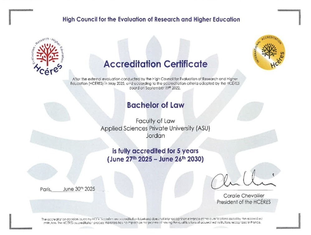 كلية الحقوق في جامعة العلوم التطبيقية الخاصة - أول كلية حقوق في المملكة تحصل على الاعتمادية الفرنسية HCÉRES
