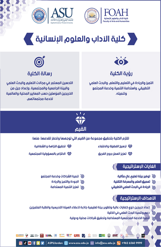 وتتبنى الكلية رؤية الجامعة المتمثلة بتحقيق التميز في المجالات العلمية والبحثية وخدمة المجتمع، والعمل على تحقيق الرؤية عن طريق رسالة سامية تسعى إلى التحسين المستمر في البرامج الأكاديمية التي تقدمها الكلية والبحث العلمي وخدمة المجتمع، والالتزام بمعايير الحاكمية سعياً للارتقاء بعناصر العملية التعليمية والتعلمية، ووصولاً إلى التنافسية على المستويين المحلي والدولي ، وقد رسمت الكلية لنفسها خطة إستراتيجية تستهدف إعداد خريجين ذوي كفايات عالية ودعم البحث العلمي في الكلية وتنميّته، وتقديم خدمة نوعية للمجتمع، عن طريق إعداد خطط دراسية محكمة وقابلة للتطوير والنمو بما يتناسب وسوق العمل وحاجاته. وتفخر الكلية بأعضاء هيئة التدريس الذين يحملون رتباً علمية مختلفة وتخرجوا في أرقى الجامعات العربية والعالمية المشهود لها بالتميز والجودة، ولديهم رصيد بحثي في المجلات العالمية والمحلية، ومشاركات عديدة في مؤتمرات علمية داخل الجامعة وخارجها. ولا يغيب عن الكلية أهمية الأخذ بالمعايير العالمية في الإدارة والجودة التعليمية، فقد حصلت الكلية على شهادة ضمان الجودة الصادرة عن هيئة اعتماد مؤسسات التعليم العالي وضمان جودتها في الأردن عام 2018/2019 ، وتجتهد الكلية في الترشح للحصول على اعتمادات أكاديمية عالمية ؛ لمواكبة كل ما هو جديد. ولأن البحث العلمي الرصين معيار أساسي في بناء المنظومة العلمية التعليمية لأي صرح علمي مميز؛ فإن الكلية لا تألُ جهداً في حفز منسوبيها على إنجاز أبحاث علمية ذات قيمة بحثية تقدم إضافة نوعية للمجتمع، وتكون ذات تأثير واسع وعالمي، وتتجاوز حدود الجامعة والوطن لتصل إلى العالمية من خلال النشر في قواعد بيانات مصنفة ضمن قاعدة بيانات Scopus و (ISI) وتحفيز أعضاء الهيئة التدريسية كذلك على تشكيل فرق بحثية مشتركة داخل الكلية وخارجها ومع باحثين خارجيين . وتضم الكلية عدداً من القاعات المجهزة بإمكانيات متطورة ومختبرات علمية متميزة وفق معايير دولية تلبي حاجات الطلبة ، كمختبر المرئي والمسموع (9165) ومختبر الترجمة الفورية (9173)، اضافة الى الاستوديو التلفزيوني والاذاعي